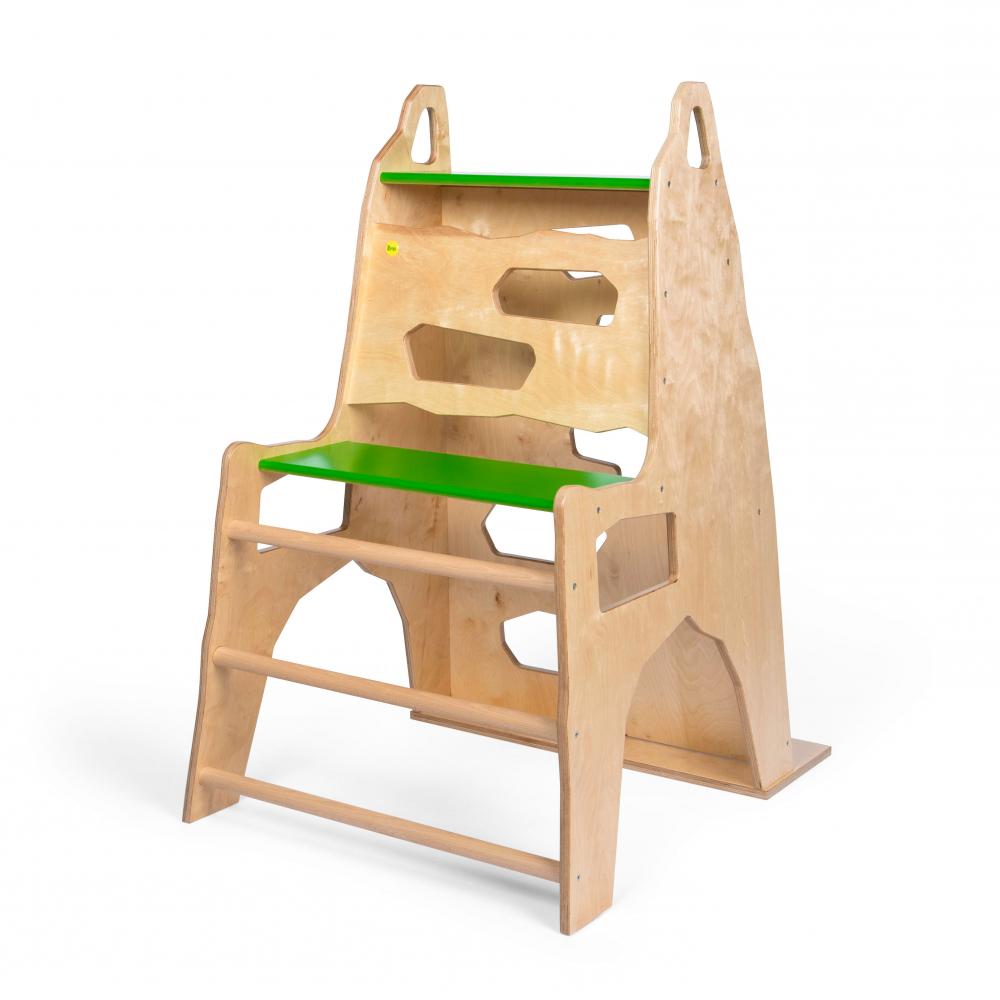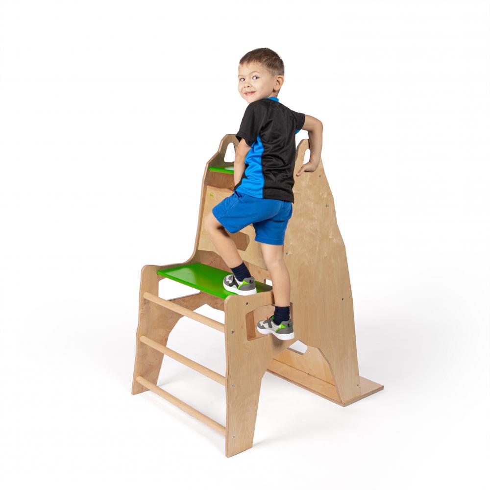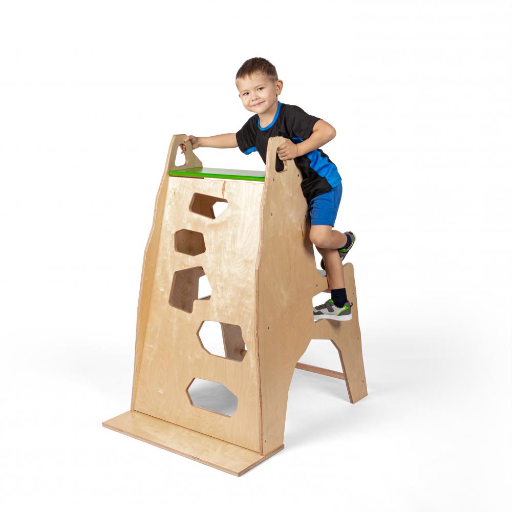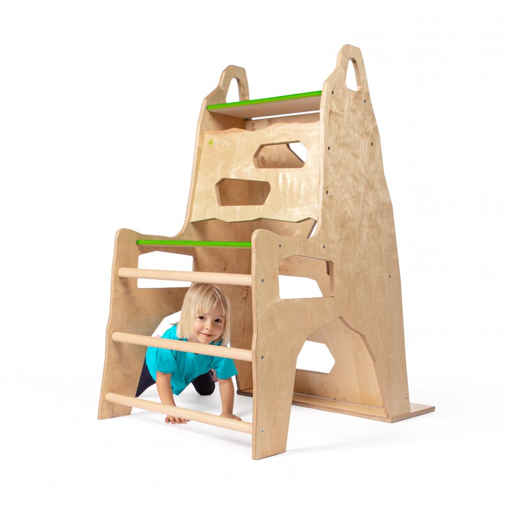 Die vierte Seite des Geräts ist mit Sprossen und Griffmulden versehen, die eine weitere Herausforderung darstellt und Kindern helfen, Ihre Kraft und Geschicklichkeit zu verbessern.